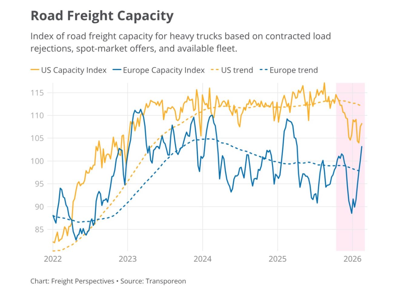 In the US, available capacity remained high through the fourth quarter of 2025, creating a favourable market environment for shippers and brokers. In contrast, capacity in Europe steadily declined, a trend that, after a brief stabilisation in 2025, has continued into 2026.